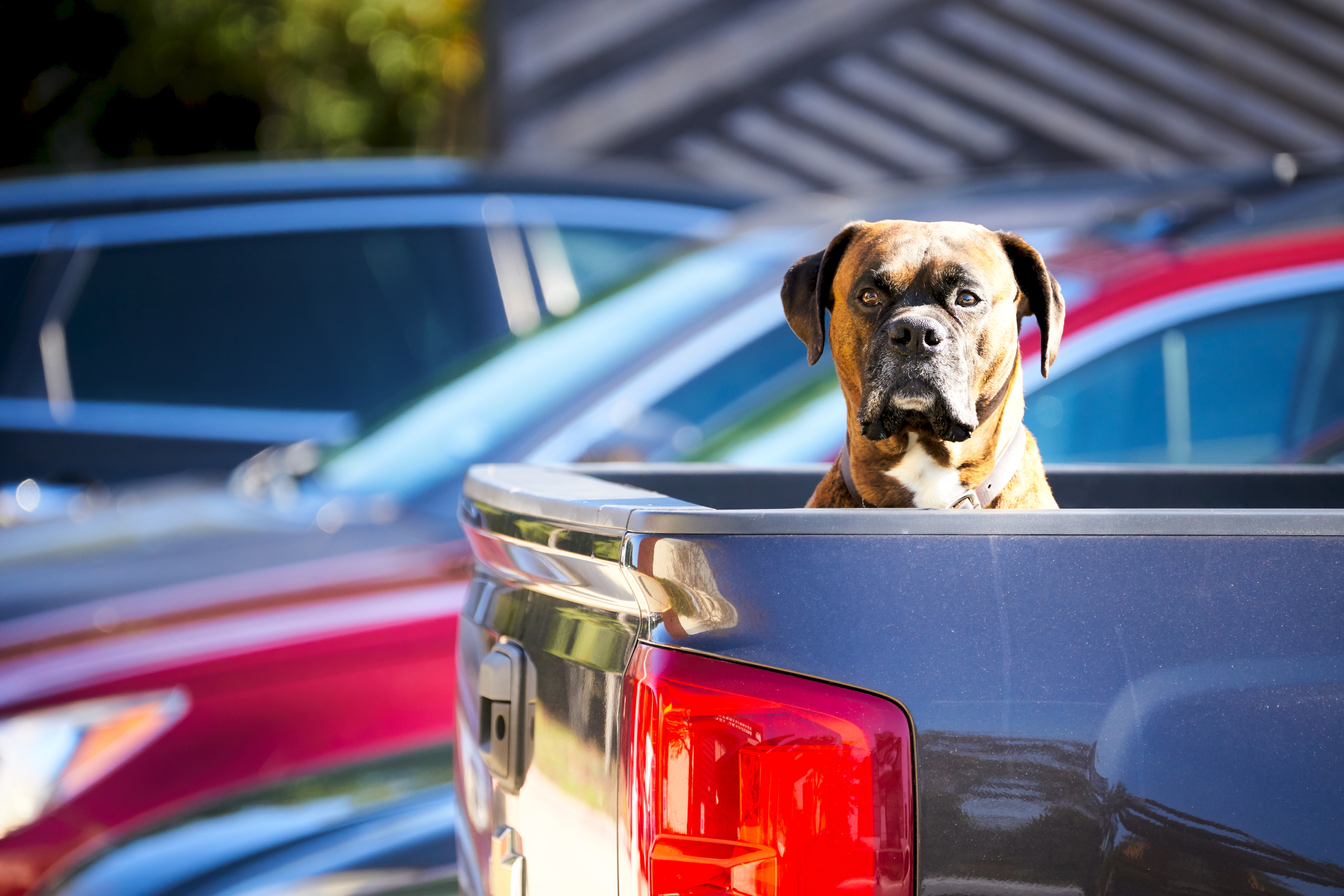 Leaving your dog in a vehicle unattended includes leaving a restrained dog outside on an open truck bed — sunlight reflecting off the truck’s metal floor can quickly lead to paw burns and heatstroke.